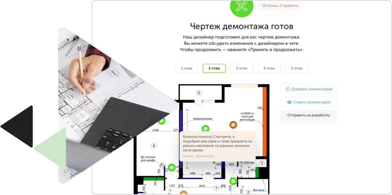 Общайтесь с дизайнером в вашем личном кабинете посредством чата, комментариев и замечаний по каждому этапу. Вы также можете общаться в чате Telegram, созданным администратором.